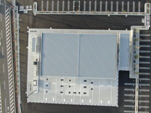 今回の屋根は現場で成型機を使い施工致しました。大きな建物を施工する時はよく行われます。
